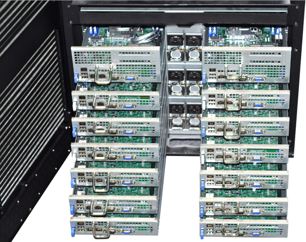 不朽情缘MG融合一体机就是解决环境使用问题而推出的综合性计算产品,它不需要专业的机房设施,不需要专业的配电和空调设备,放在办公室或实验室接墙电就可使用, 具有低噪音、低功耗等特点。最高可以安装14个双路XEON E5 处理器的刀片服务器,48个外置热插拔硬盘存储,内置一个万兆网络交换机安装空间,带有整体状态显示和控制系统,内部散热和防尘处理。专为办公室应用环境 设计,它在众多方面超越了传统机架式服务器、刀片服务器和机群服务器,是高稳定、高性能、低环境要求的新一代桌边型高性能计算机。它采用整体优化的设计, 有效降低了系统功耗,再加上其人性化的设计、很强的系统扩展能力、卓越的性价比和计算密度,可以覆盖更广泛的个人及工作组用户对高性能计算的需求,与传统 的高性能计算机相比,不朽情缘MG融合一体机可给予更有竞争力的整体解决方案,是更好满足中小高性能计算需求的理想平台。下图为14个刀片打开效果图: